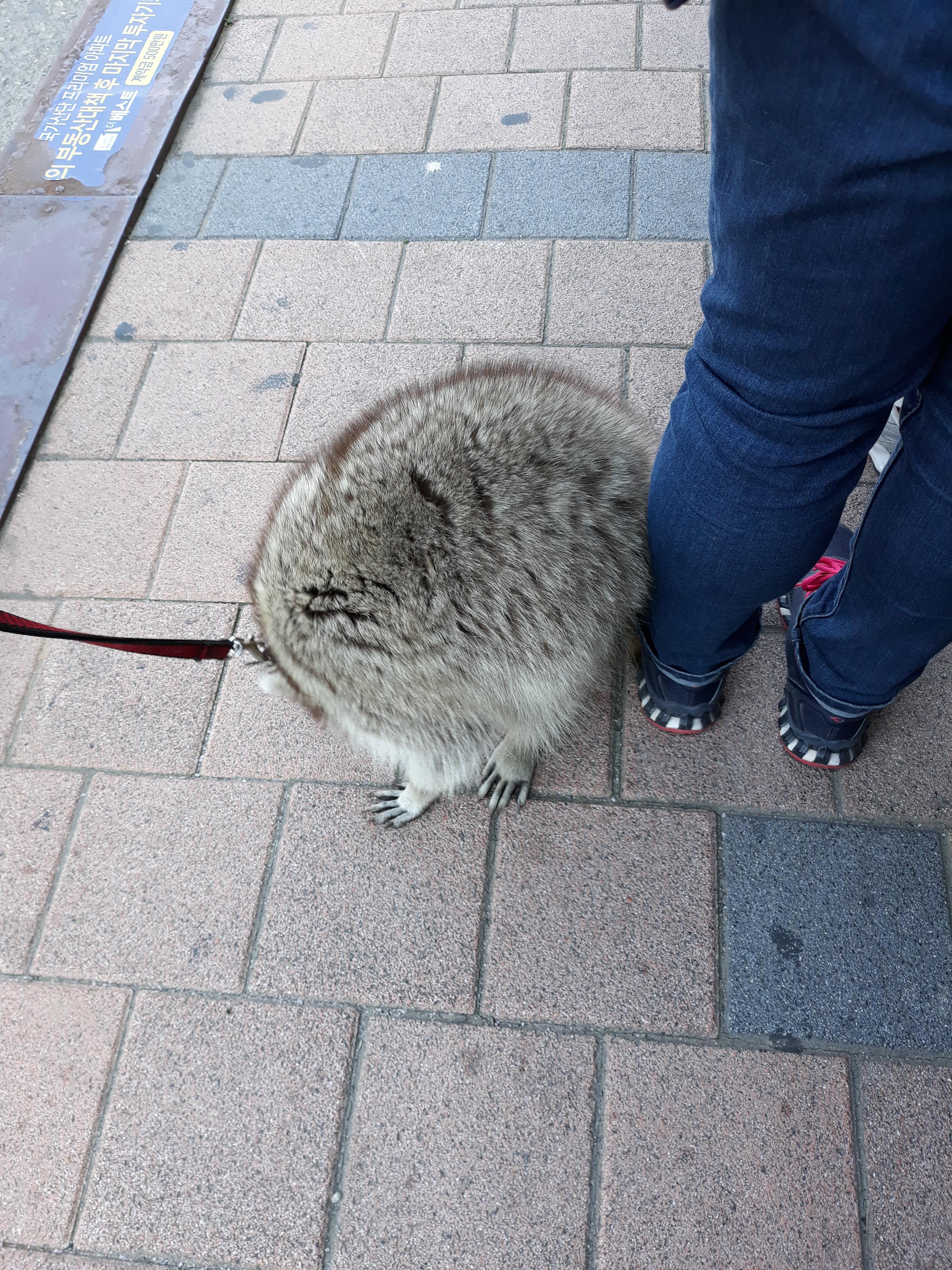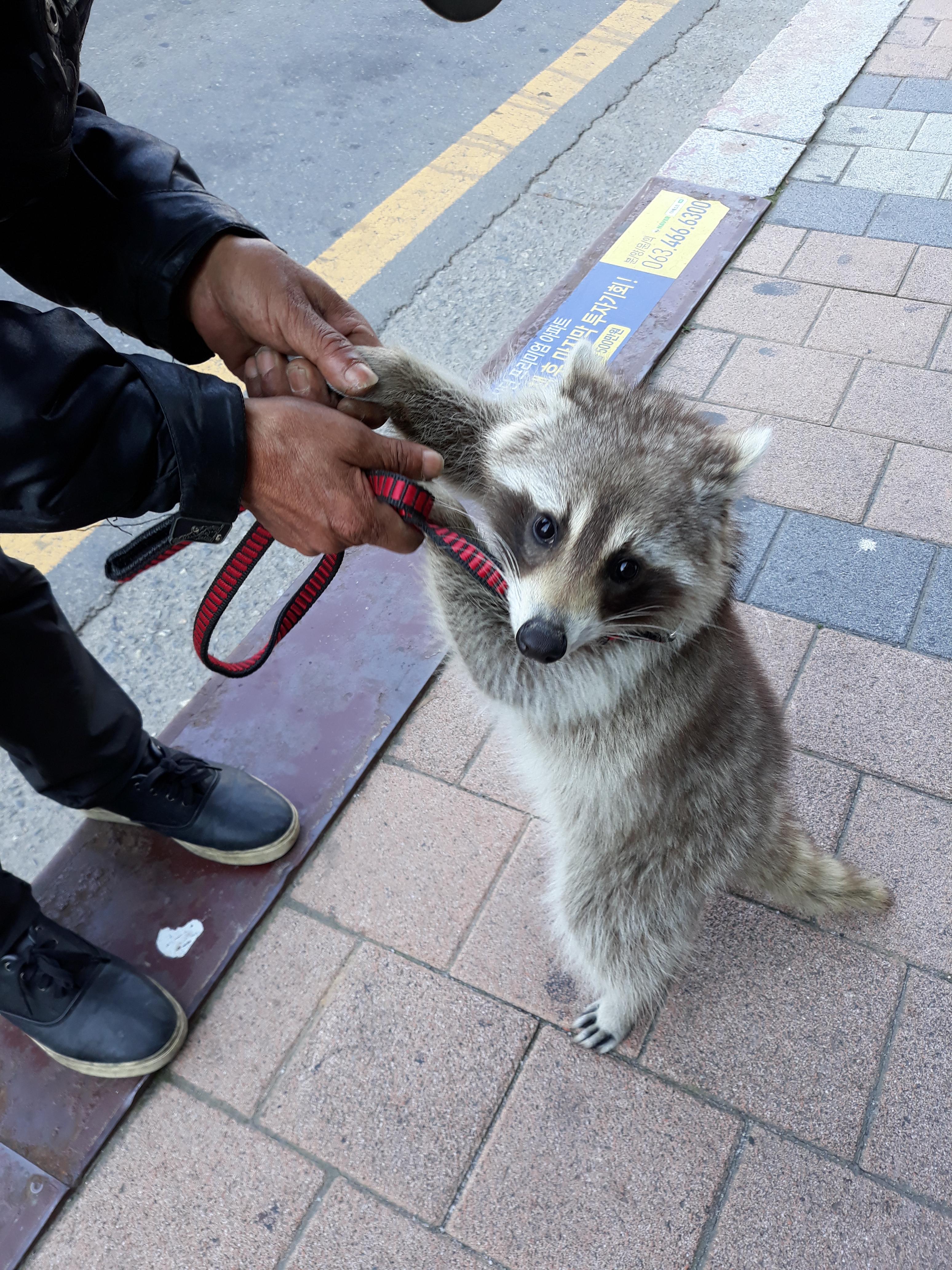 길에서 애완용 너구리 키우는 분을 만났어요~
